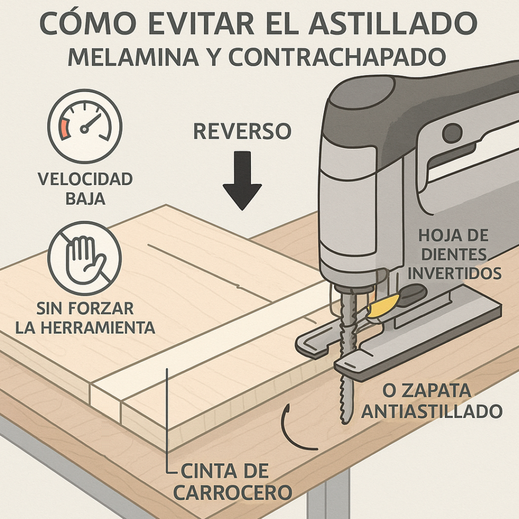 - Usa hojas de diente invertido o zapata antiastillado.